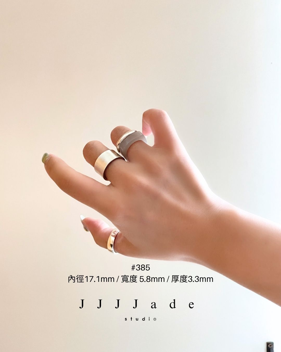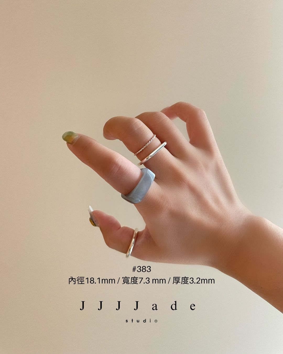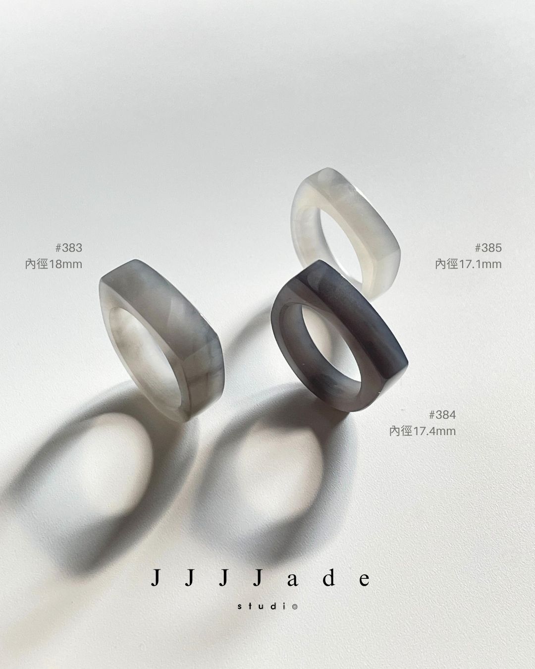 #383 內徑18.1mm / 寬度7.3 mm / 厚度3.2mm #384 內徑17.4mm / 寬度5.7 mm / 厚度3.8mm #385 內徑17.1mm / 寬度 5.8mm / 厚度3.3mm