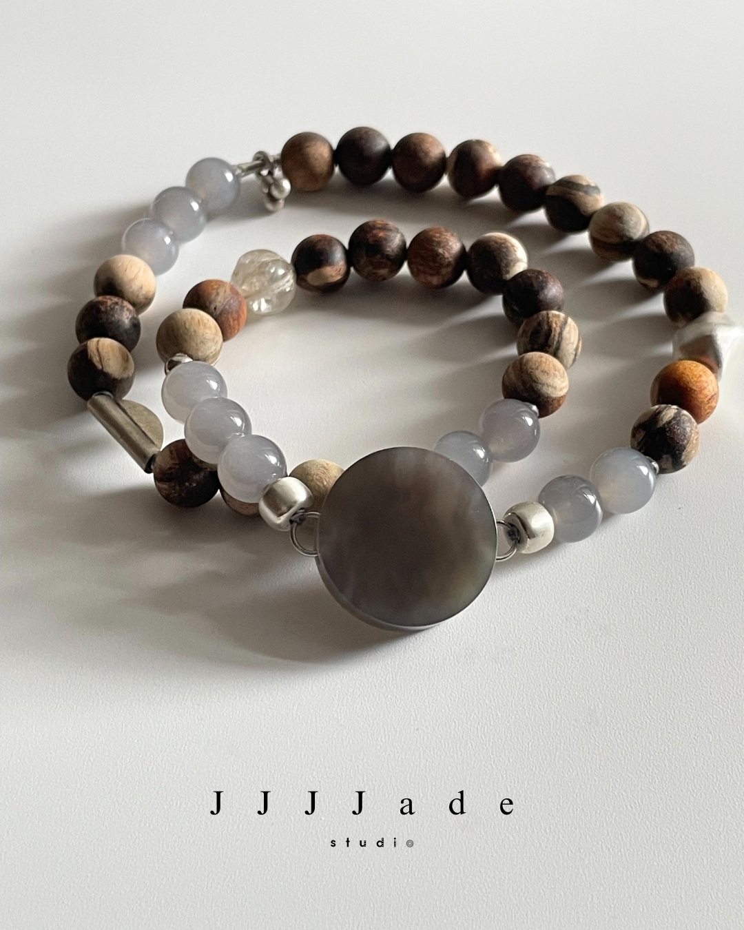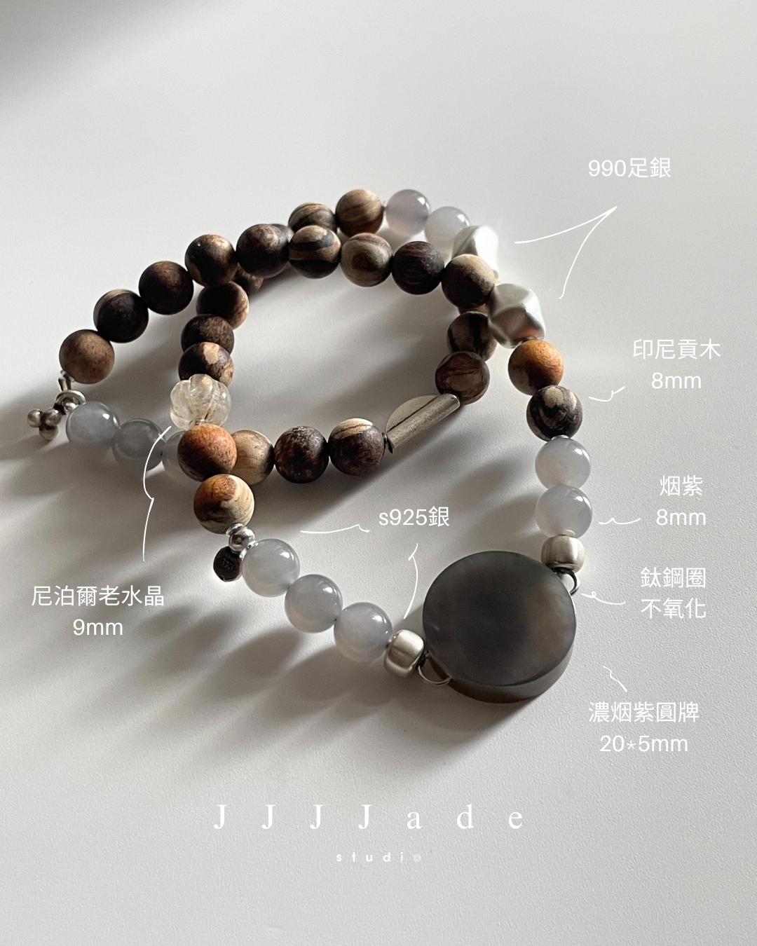 整體搭配以色階更淺的煙紫圓珠與帶有天然清香的印尼貢木交織串連,