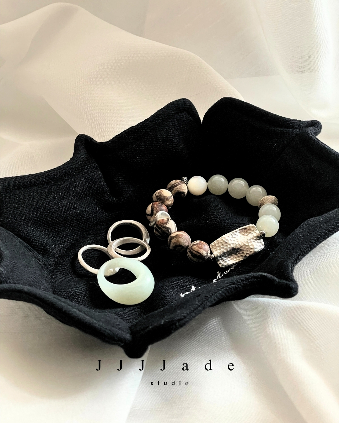 與近白的晴水和田玉並置,光影在其中交錯流動,優雅之中透著沉靜的張力。