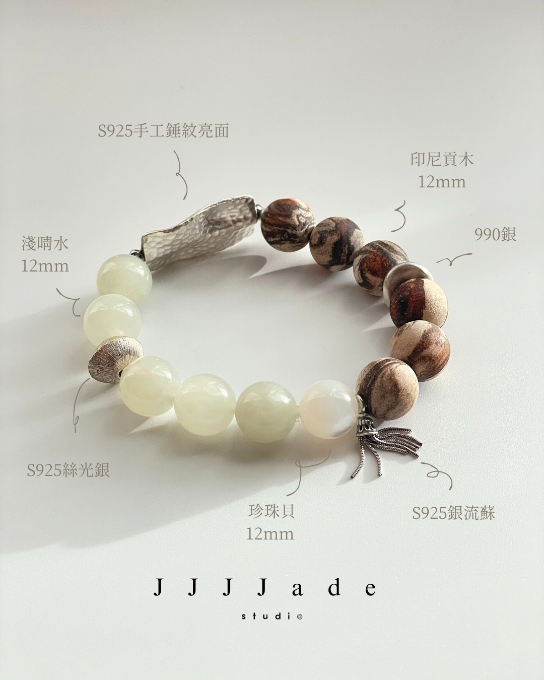 為整體增添幾分節奏與動勢。尾端以珍珠貝穩穩收束,搭配柔軟流蘇,不喧嘩,卻自然完成整體的動線。