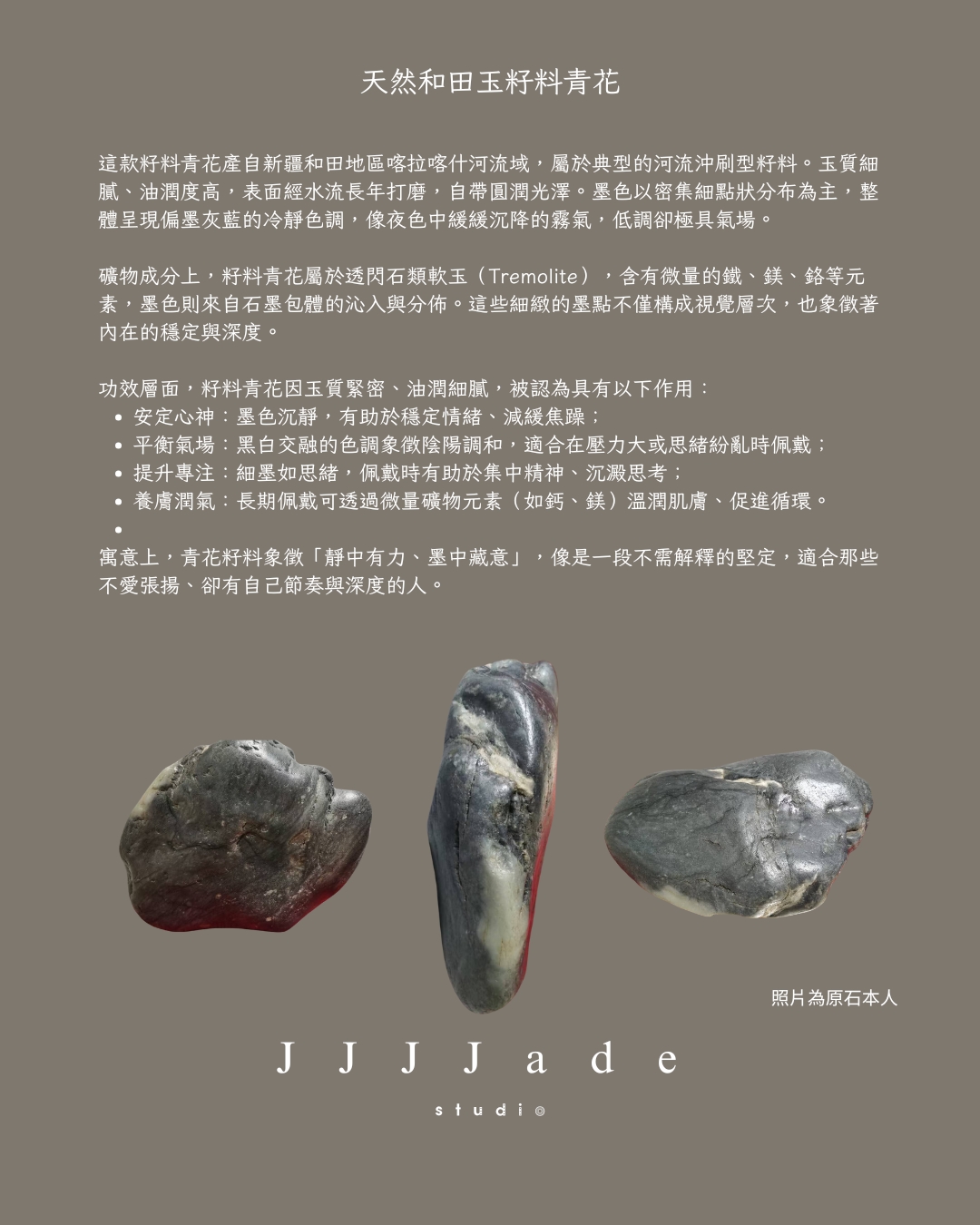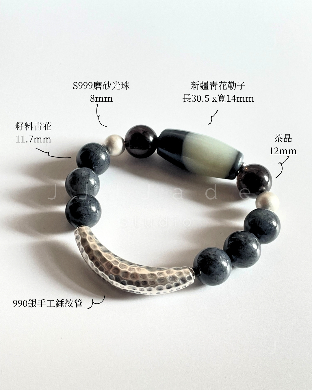 串體以深色籽料青花為骨架,最後以 S990 錘紋月牙彎管收結,