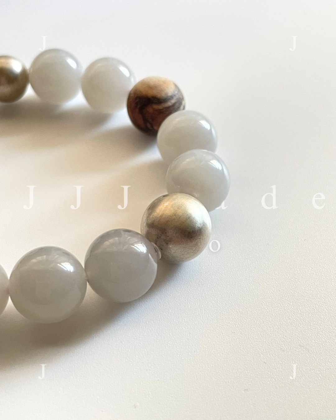 帶點灰色調的藕粉和田玉12mm珠為主體,搭配泰國手工編織銀飾,帶來粗礦的異國氣息。