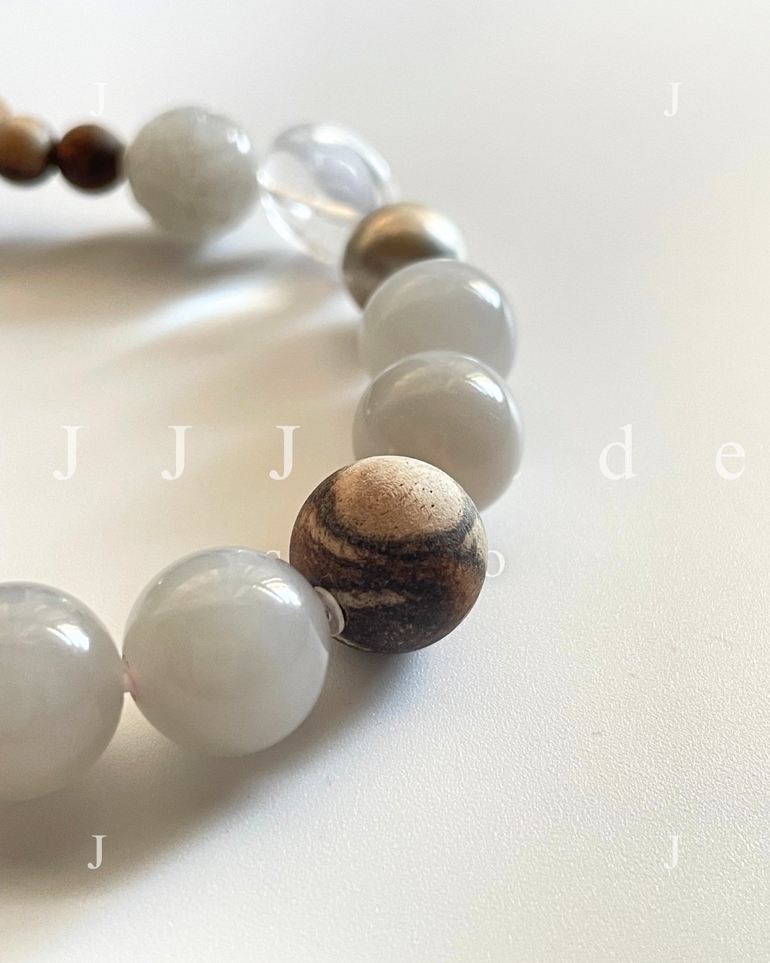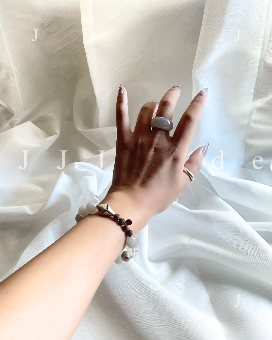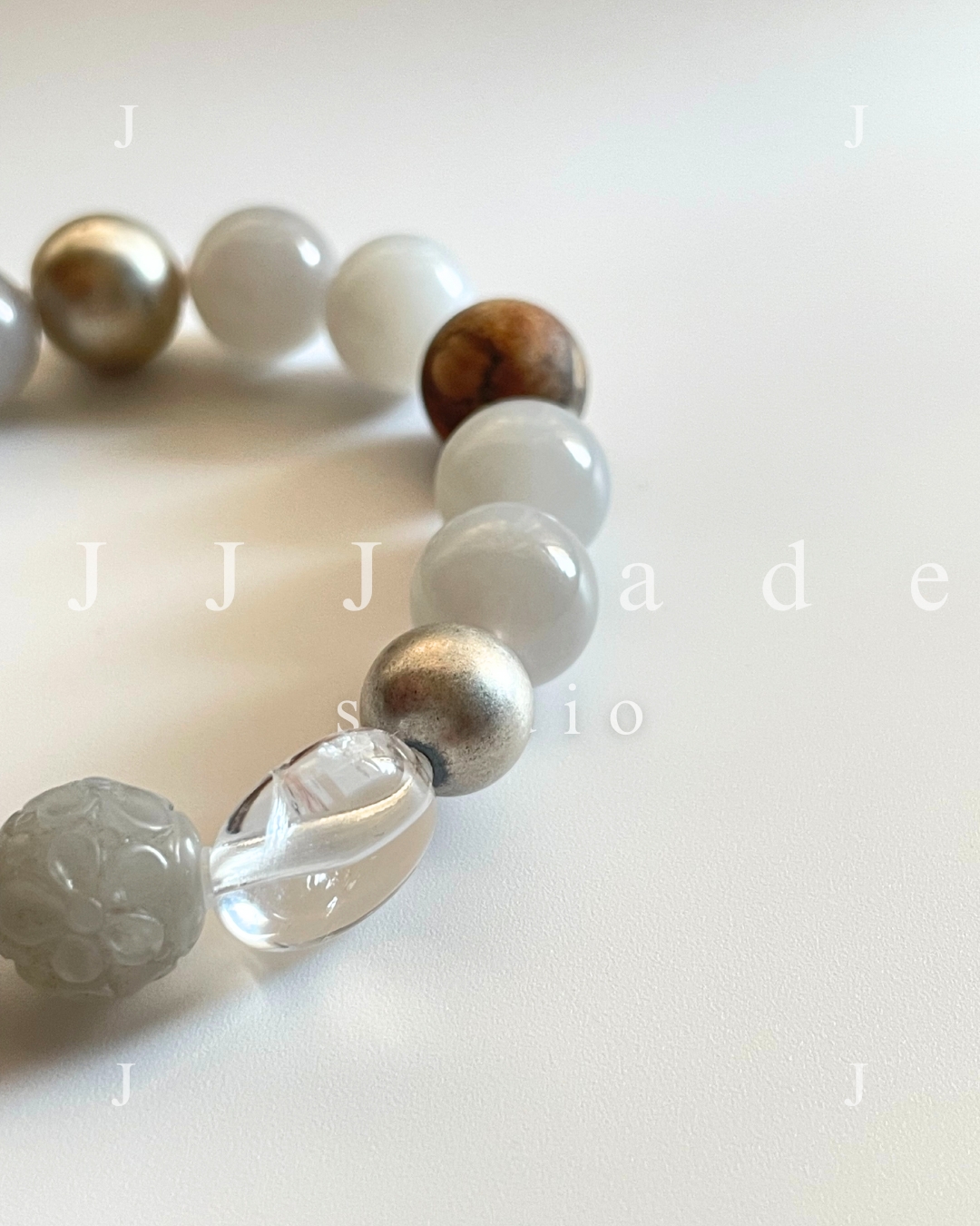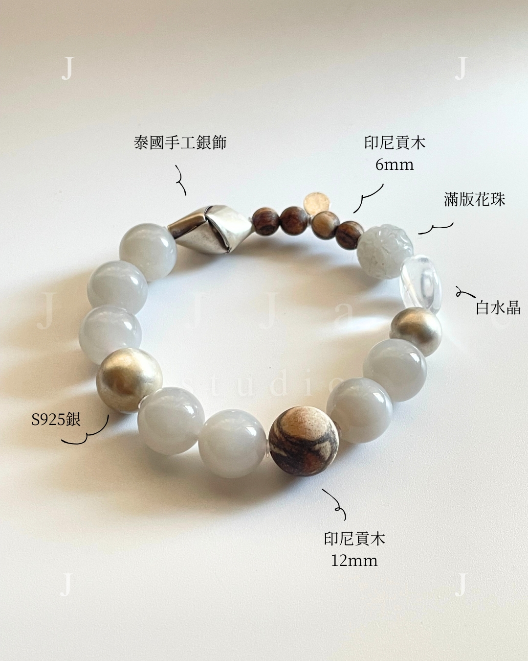 大小不同的印尼貢木相呼應,雕花珠給予層資,白水晶則在冷色調裡留下清透的呼吸。