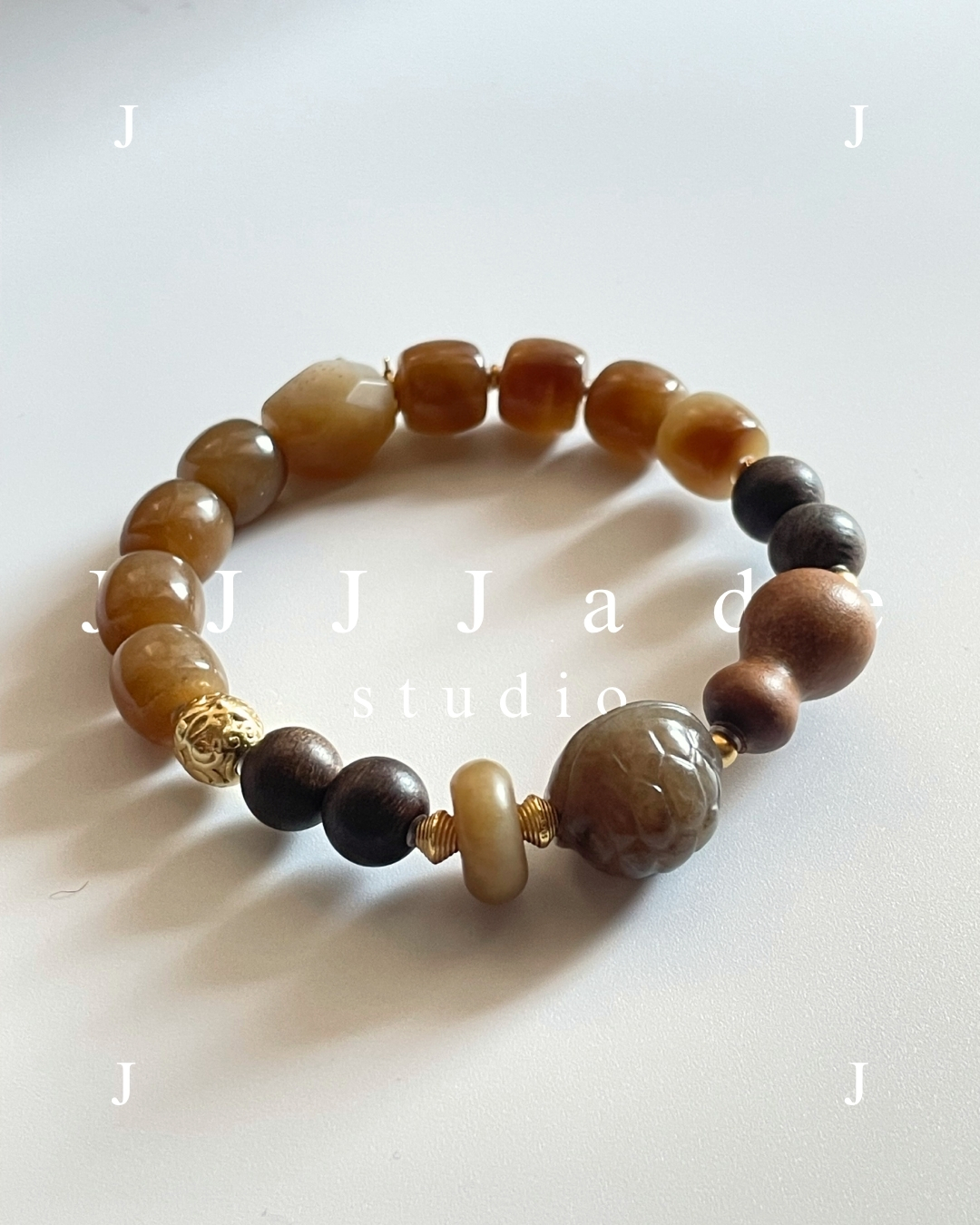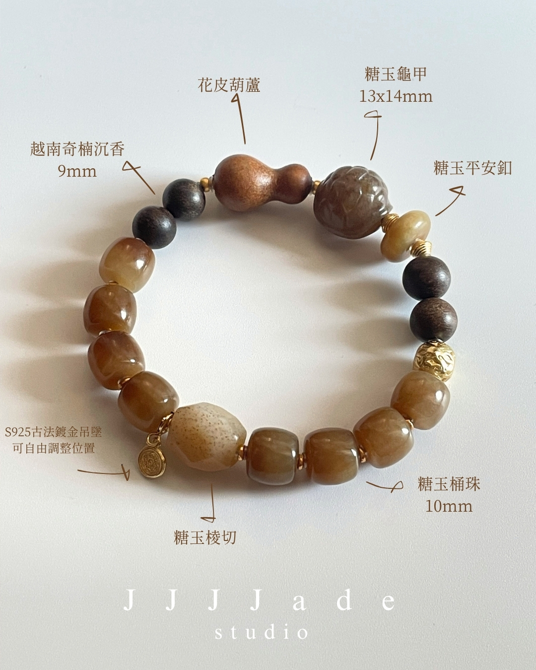 珠子間以古法鍍金的 S925 銀飾點綴,不搶眼,卻讓整體語氣更完整。