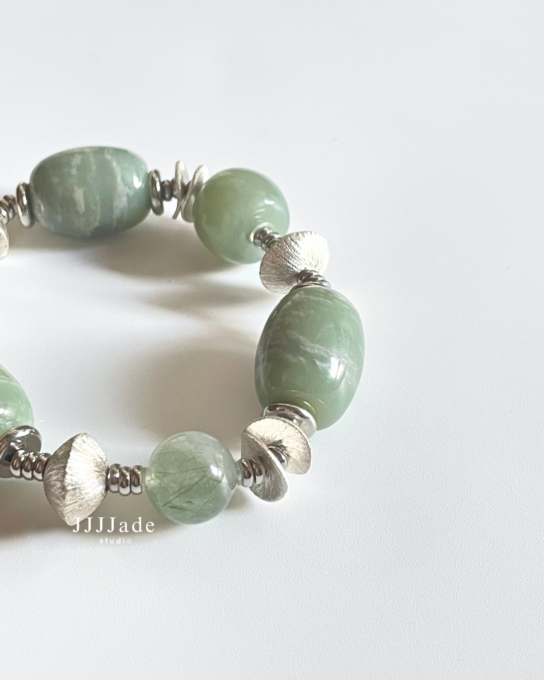 綠色生機: 搭配晶瑩剔透的綠兔毛水晶,內含的綠色纖維蓬勃茂盛,為手串注入強勁的生命力與豐盛能量,以晶體的「淺」透感,襯托玉石的溫潤。
