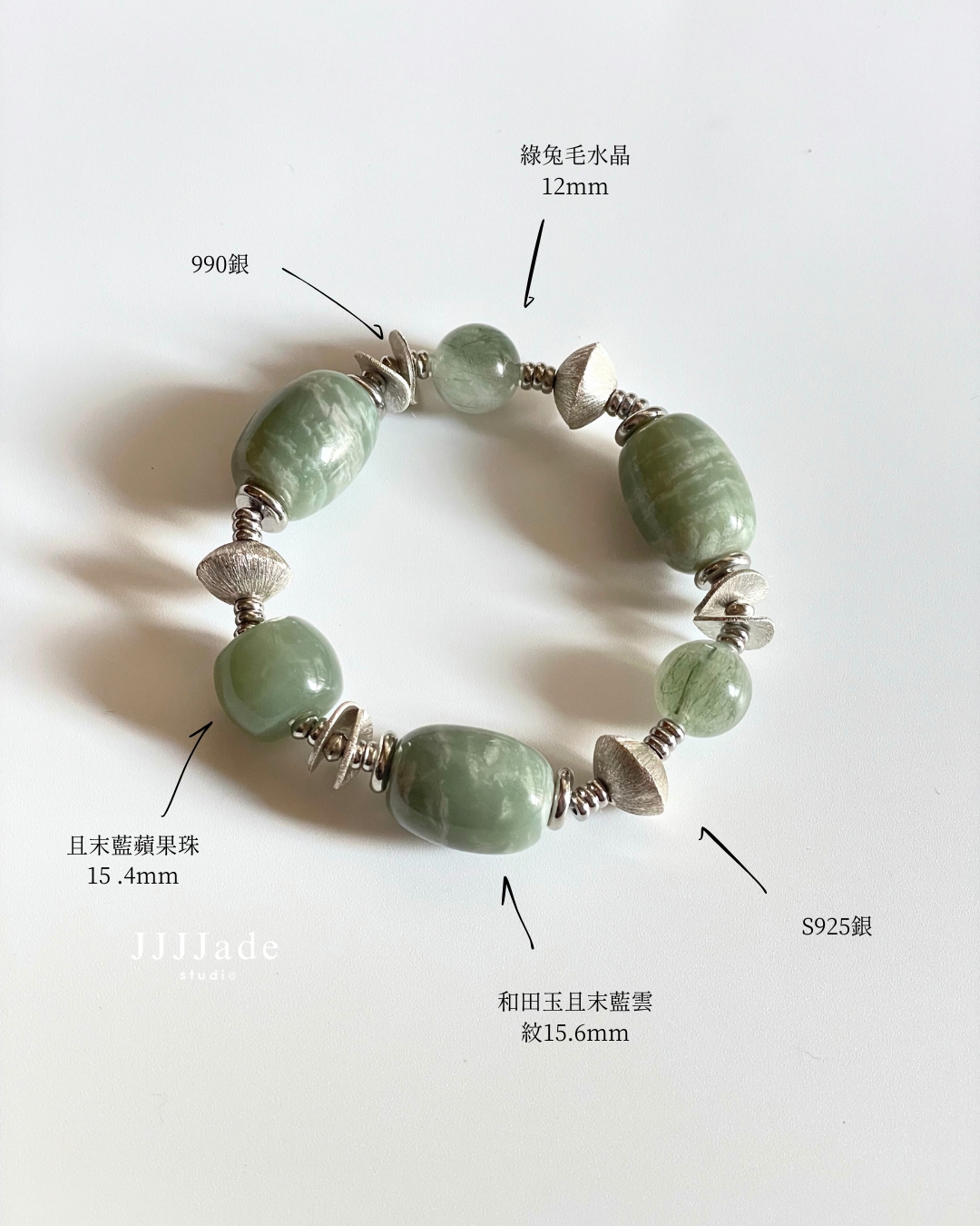 捕捉了且末藍玉石溫潤清淺的色澤,並將大自然最原始、最不規則的天然紋路(特色料)視為核心時尚元素。我們不追隨標準,而是頌揚這種獨一無二的生命印記。這份溫潤青雅的色調,搭配綠兔毛水晶的晶瑩生機,共同構成一幅清新、充滿層次的腕間畫卷