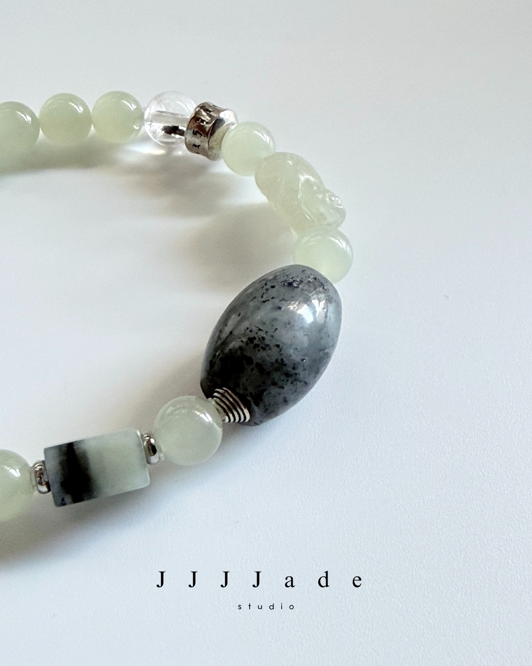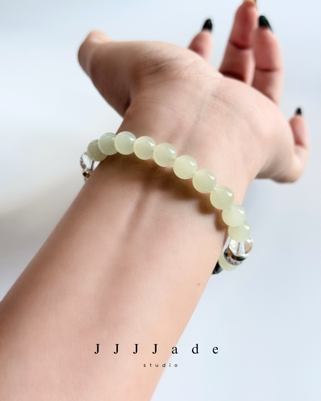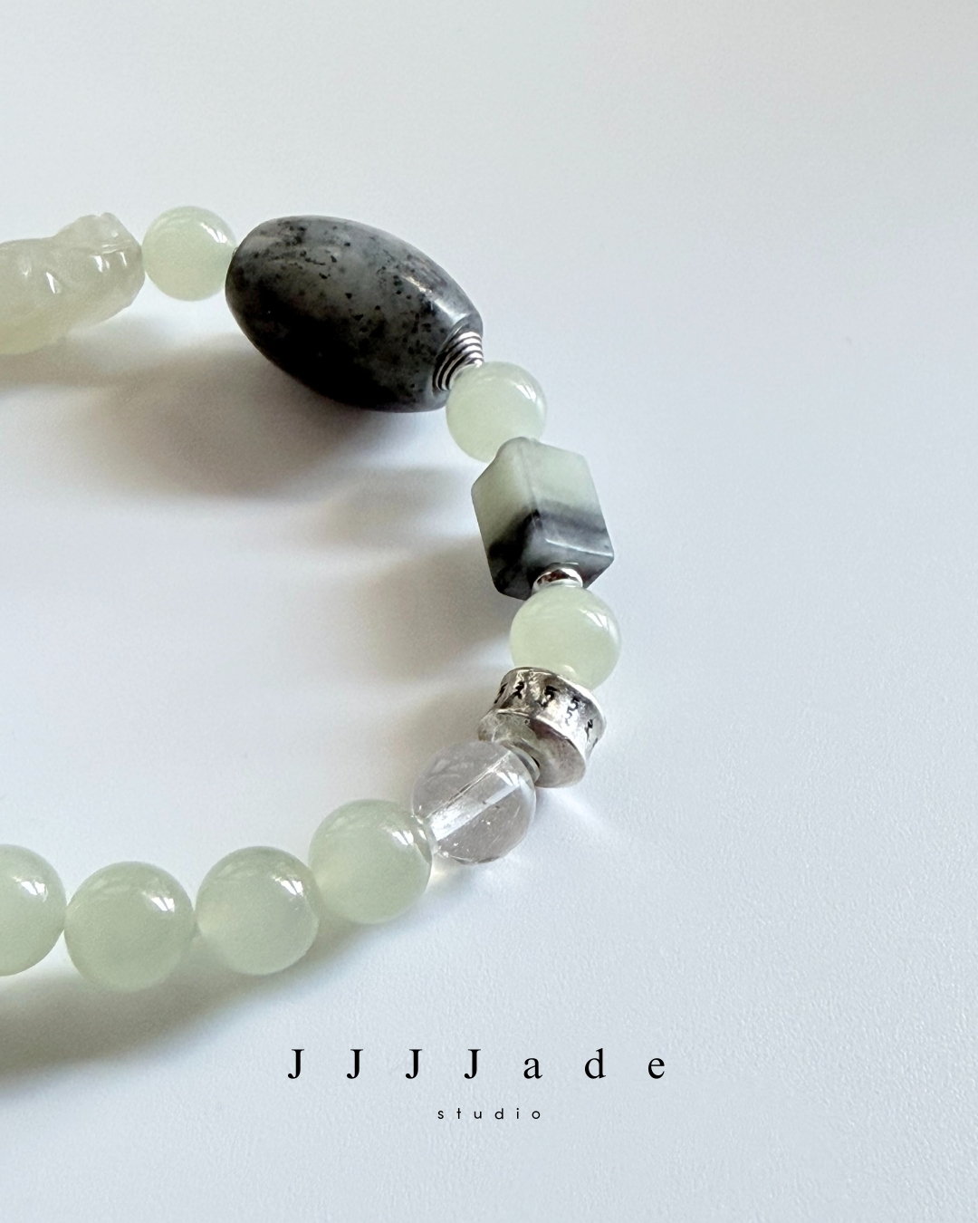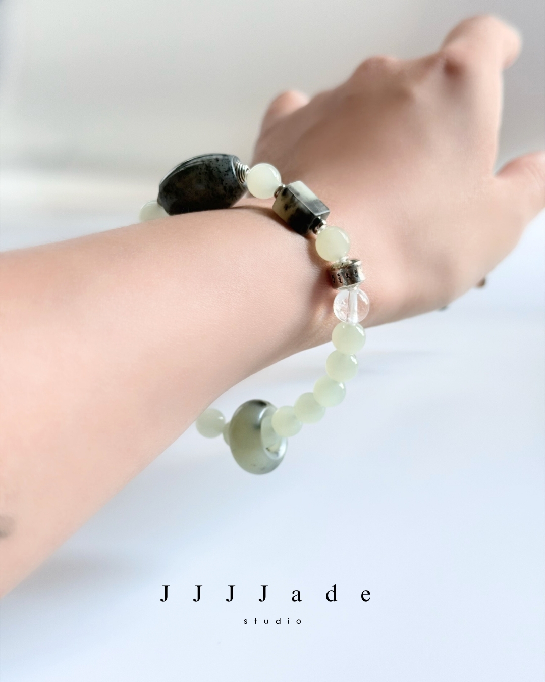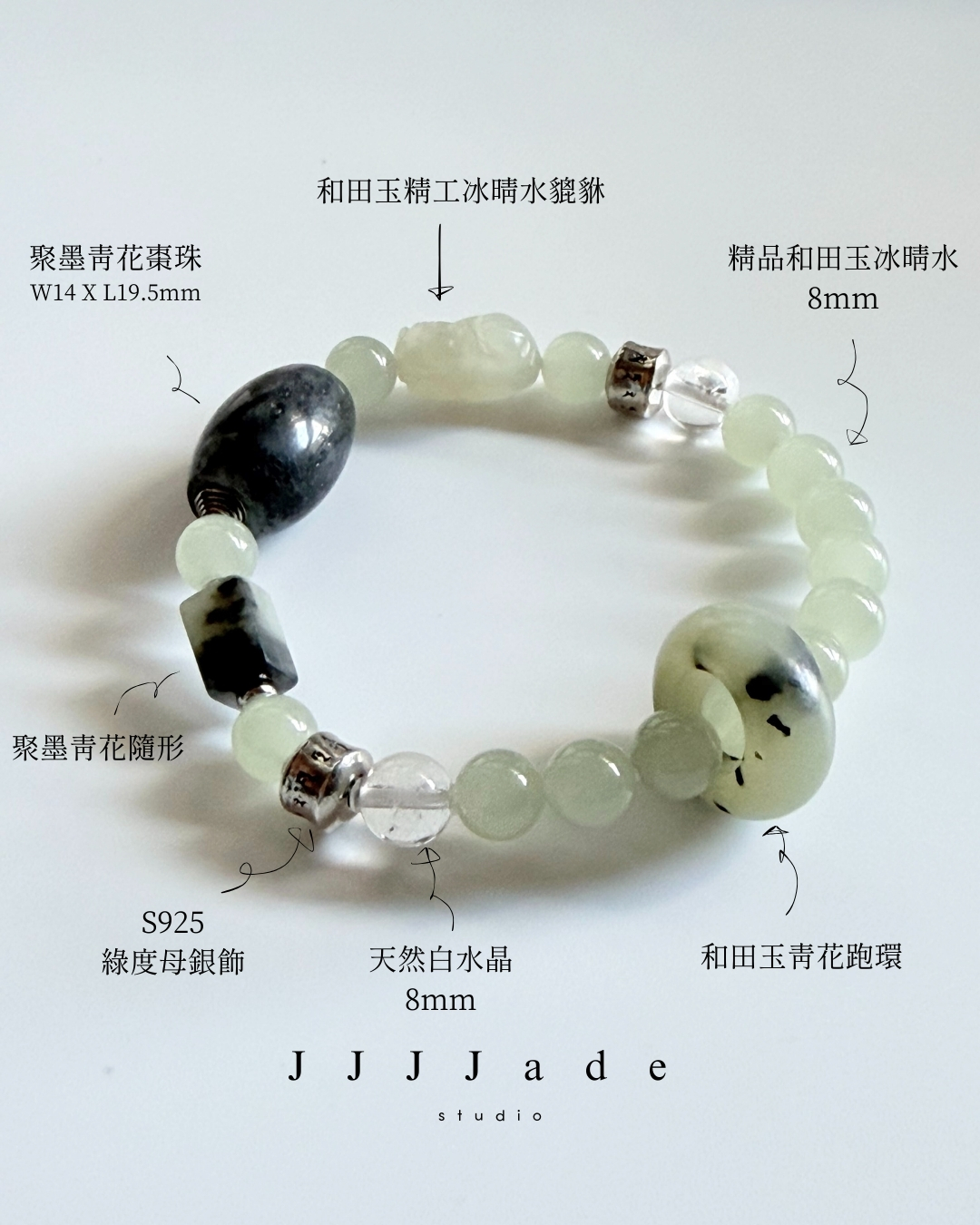 以2顆白水晶純淨的透明度作為清雅的過渡與留白,使玉料之間的連結更為輕盈。