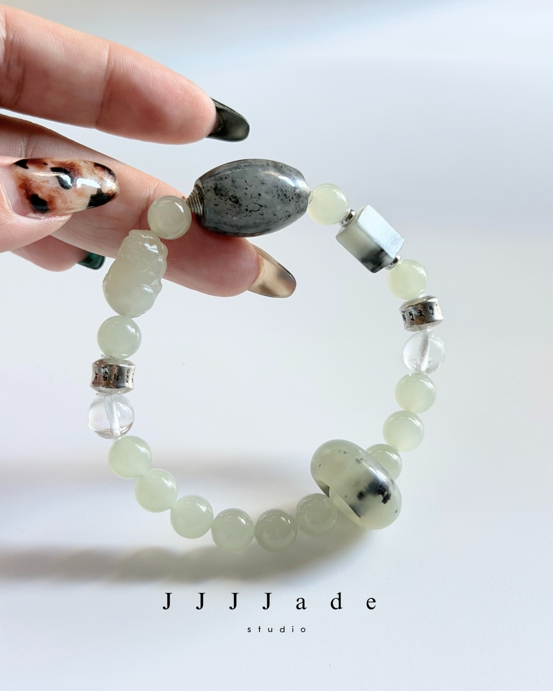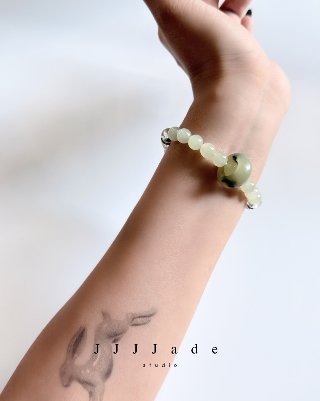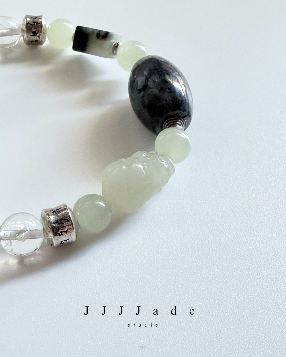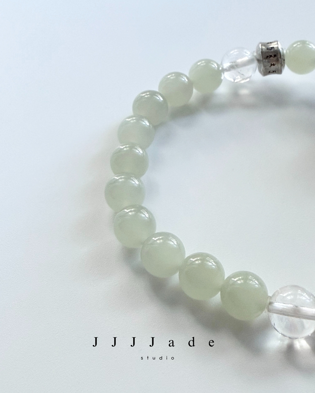 採用刻有精緻綠度母經文的 S925 純銀飾作為點綴,不僅在材質上形成了玉石與金屬的光澤對比,