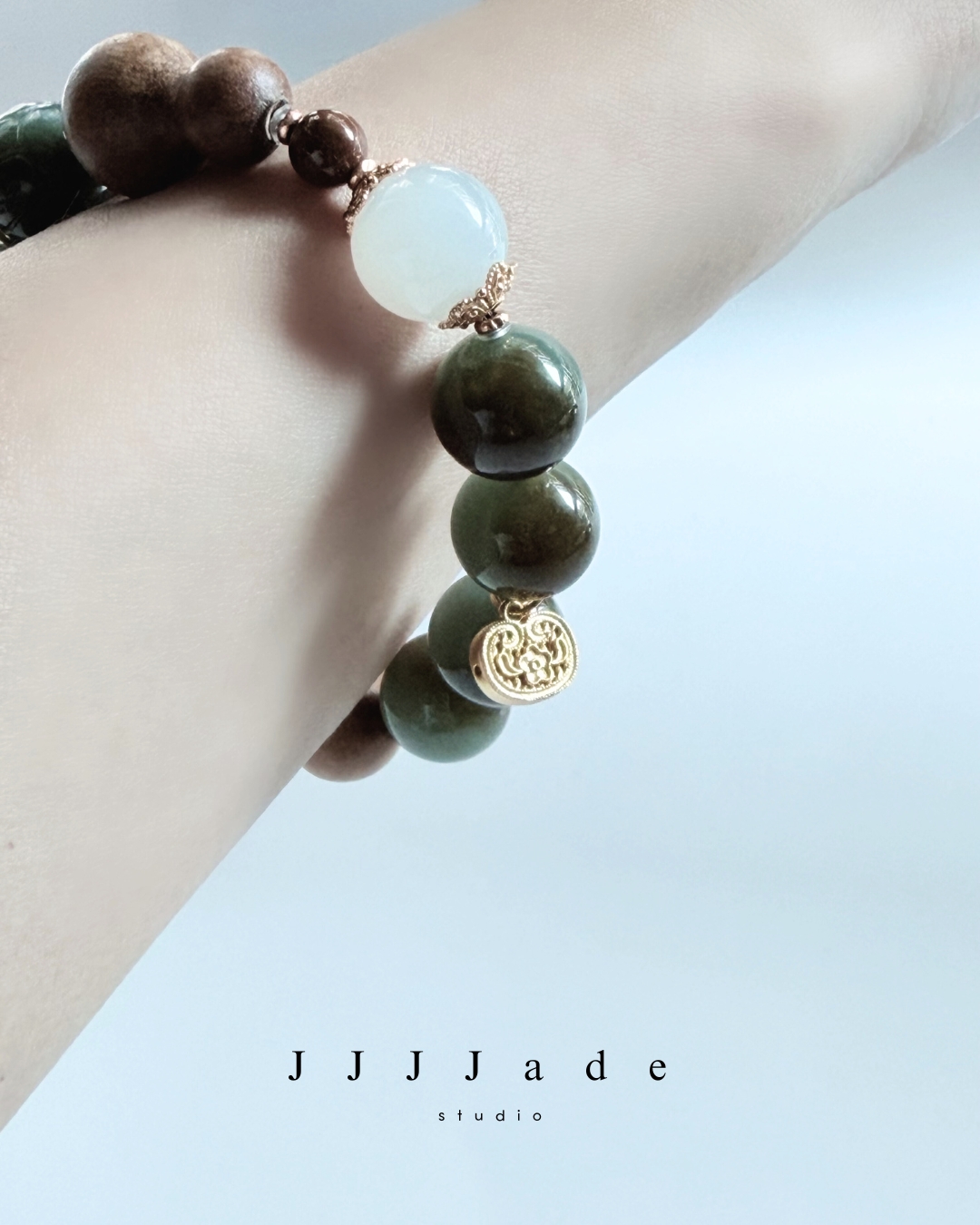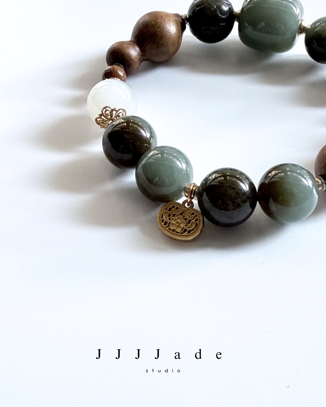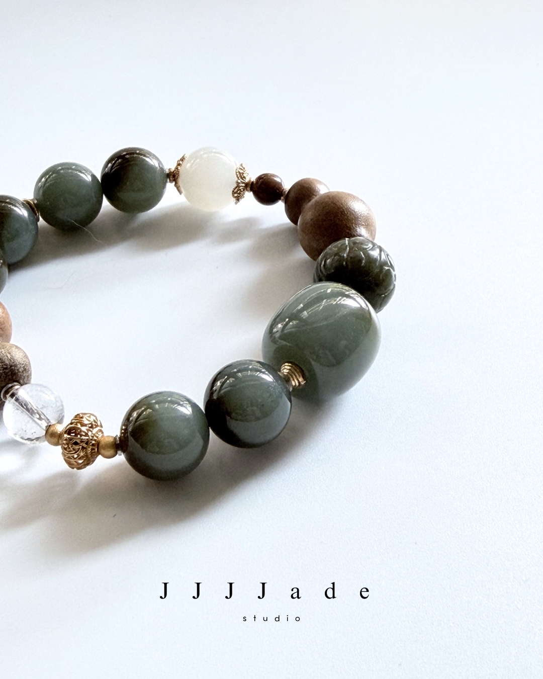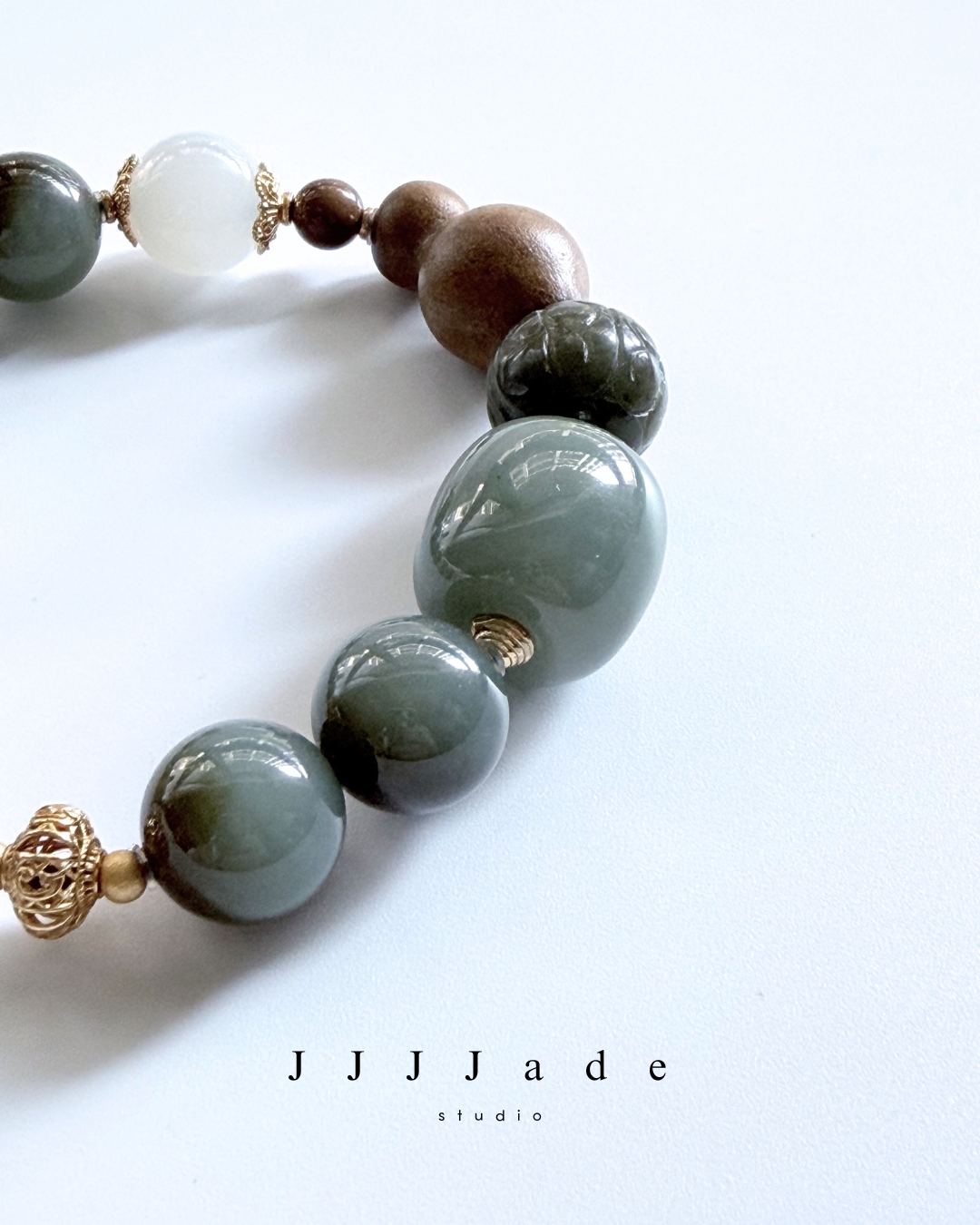 在深色調的遞進中,我們以一抹溫潤的籽料白玉做出大膽跳色,並