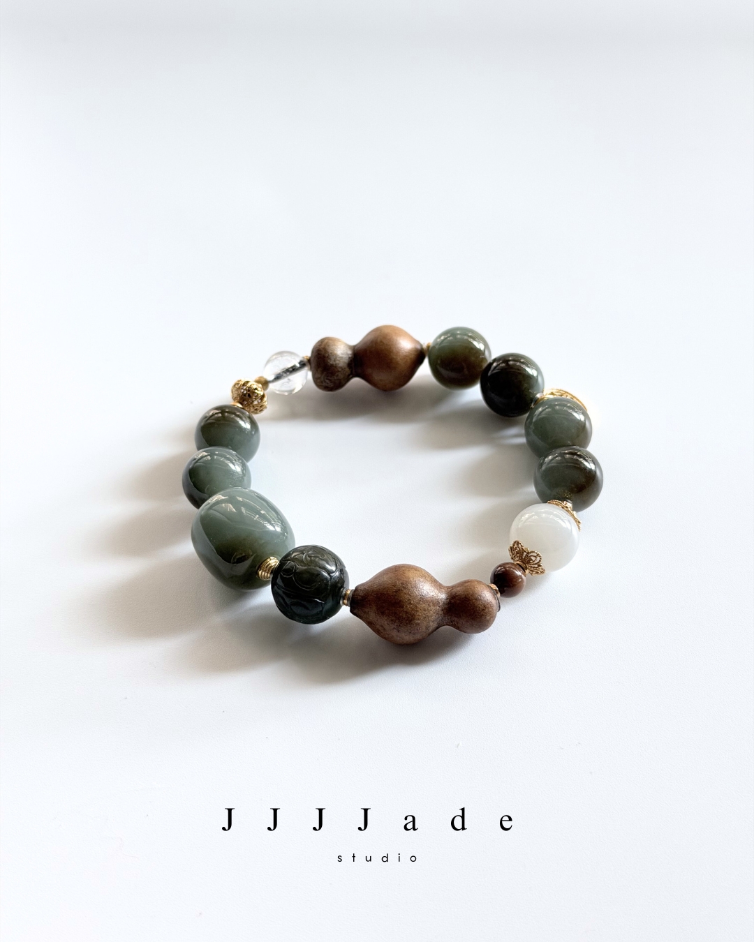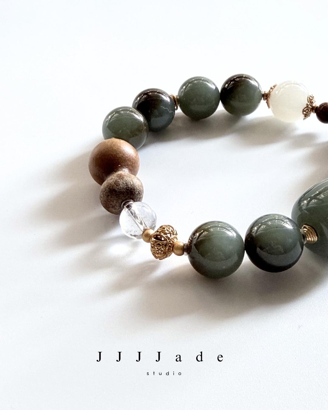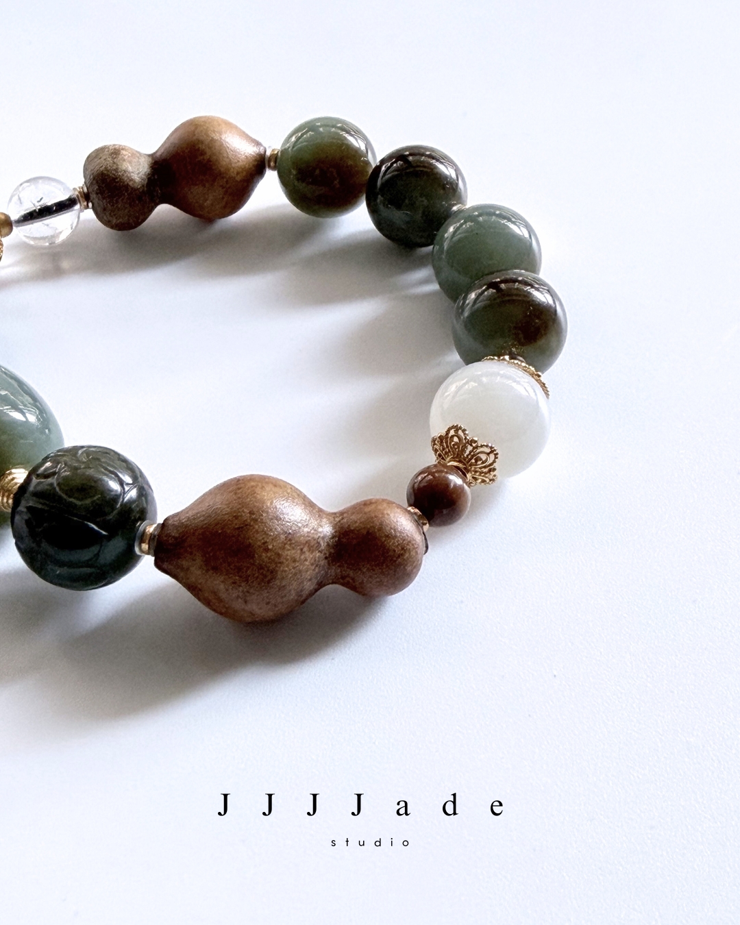 在深色調的遞進中,我們以一抹溫潤的籽料白玉做出大膽跳色,並