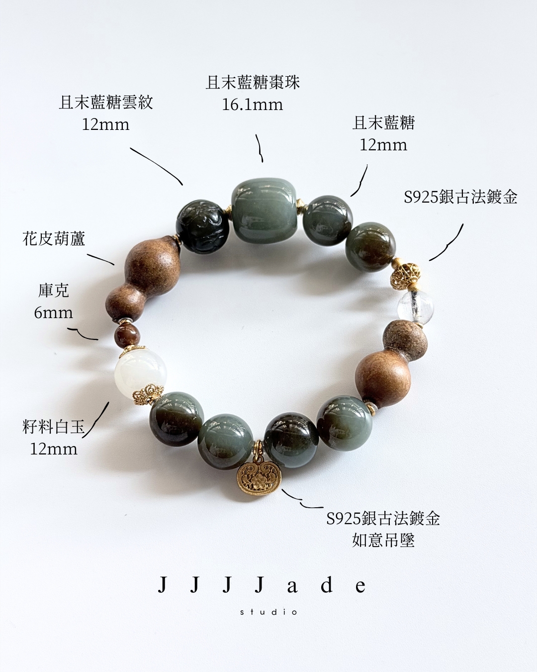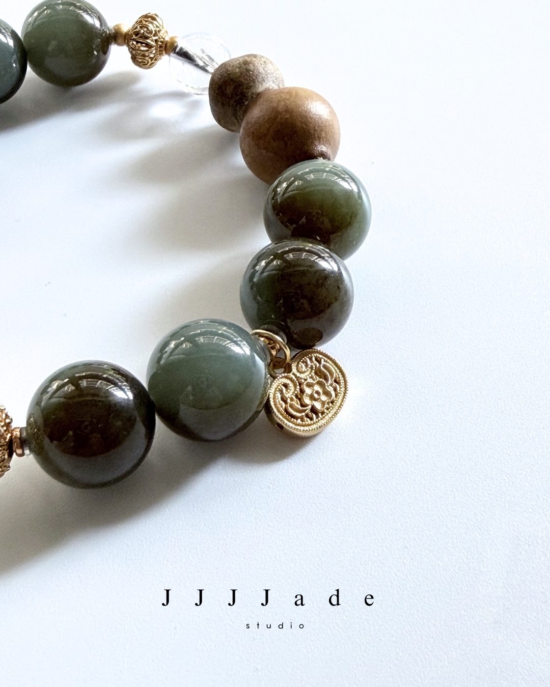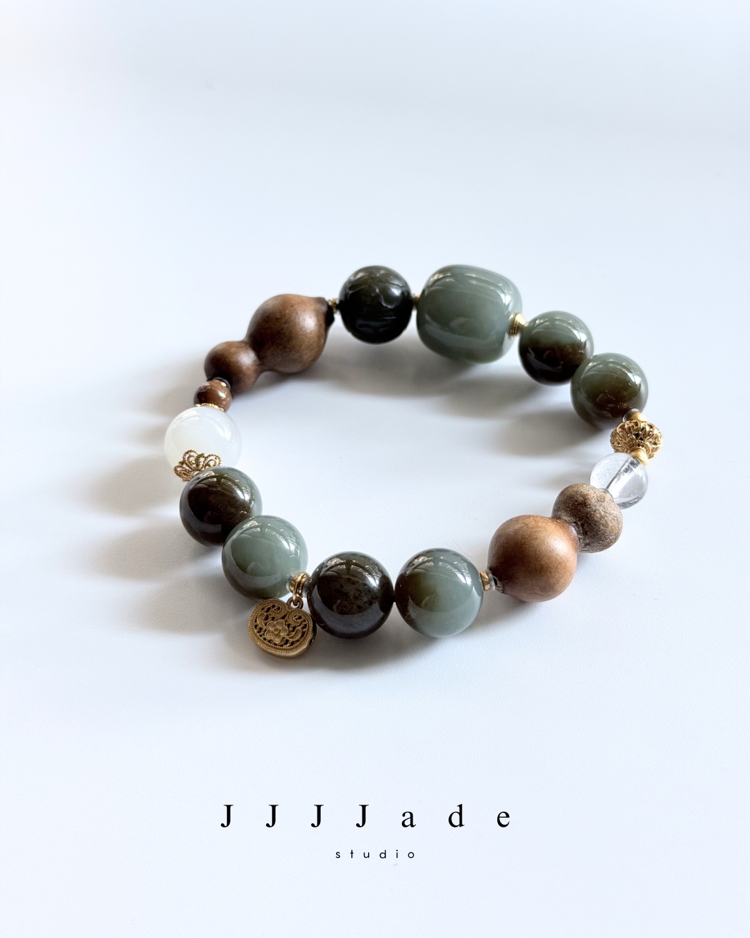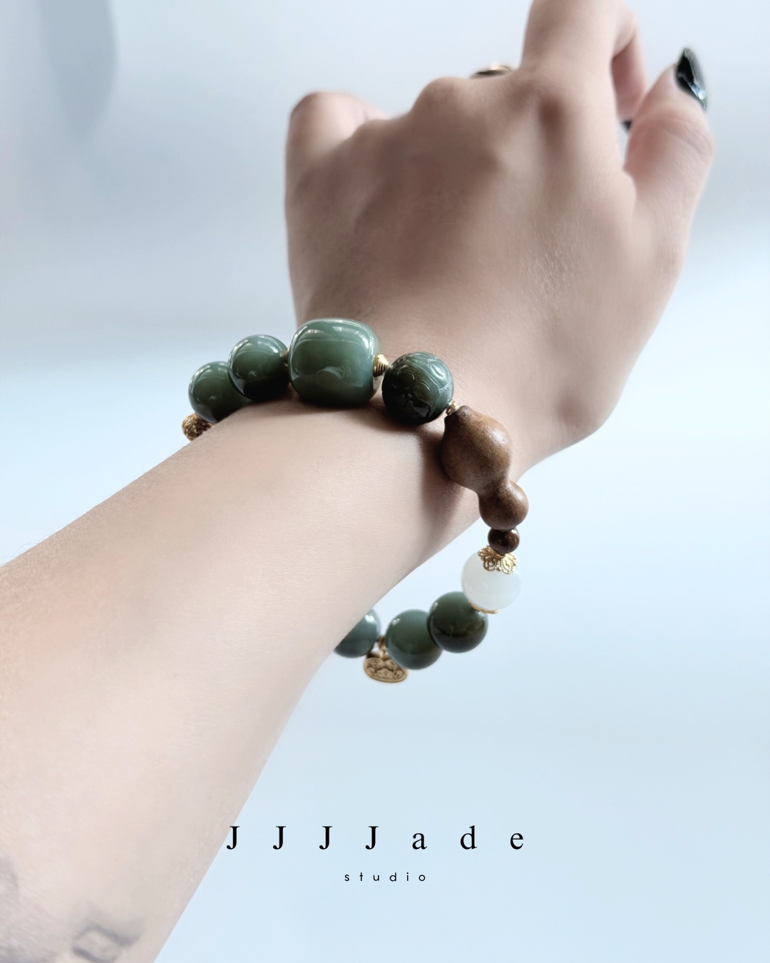 在深色調的遞進中,我們以一抹溫潤的籽料白玉做出大膽跳色,並